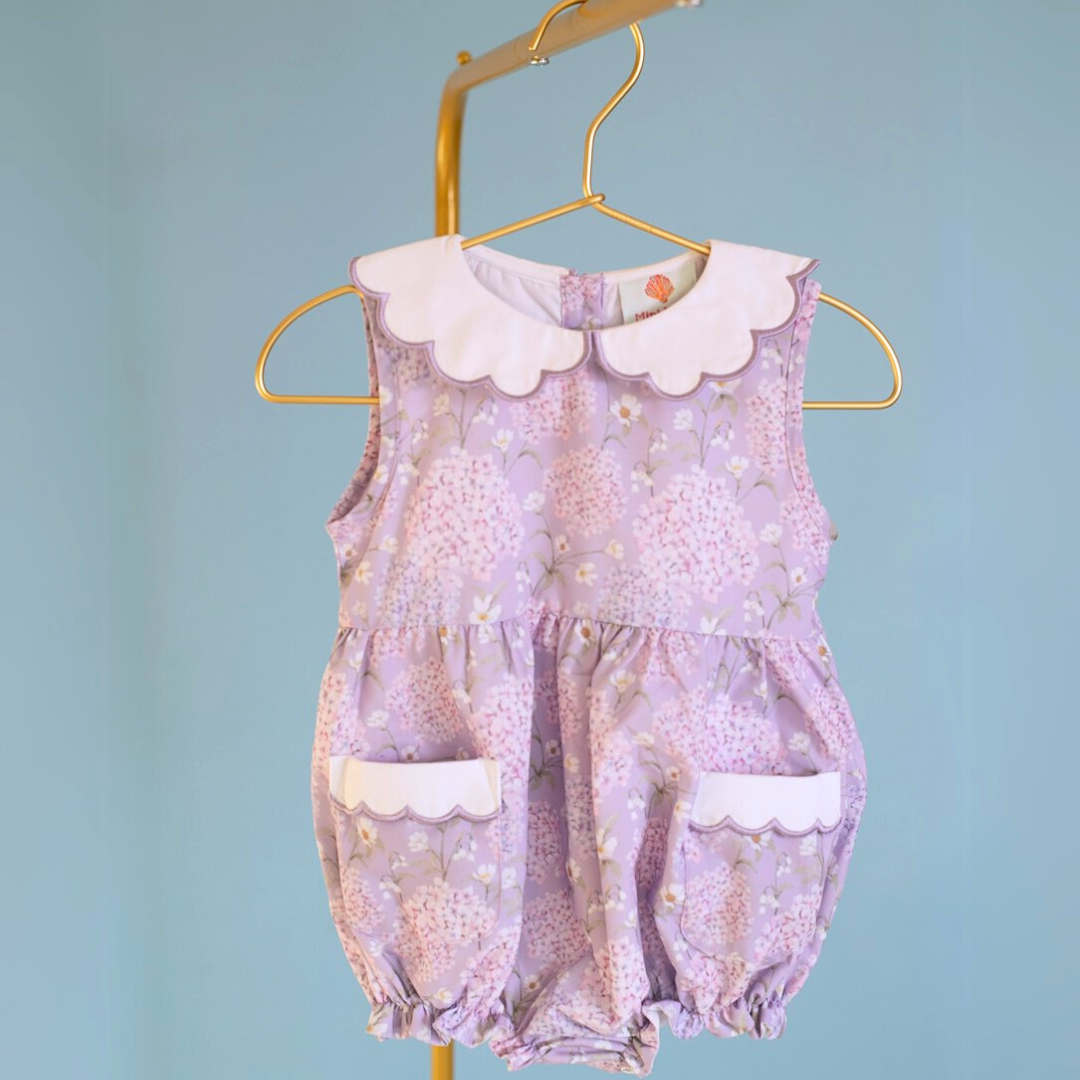 - Scalloped collar with lavender trim